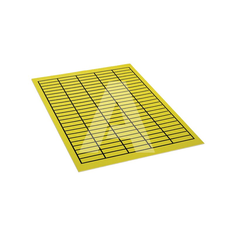 Etykiety samoprzylepne wykonane z żółtej tkaniny. Format A4. Możliwość wygodnego usuwania i przeklejania etykiet w inne miejsca. Po usunięciu nie pozostawiają resztek kleju na powierzchni. Dostępne w dwóch wersjach: z ramką w czarnym kolorze lub bez ramki. Przeznaczone także do stosowania na trudnych powierzchniach. Do profesjonalnego, trwałego nanoszenia oznaczeń zaleca się użycie niezmywalnych pisaków T82. Wykonane z żółtej tkaniny, etykiety do opisu ręcznego stosowane są wszędzie tam, gdzie ważna jest widoczność etykiet lub są one wykorzystywane tymczasowo. Syntetyczny klej kauczukowy umożliwia wygodne odklejenie etykiety i przeniesienie jej w inne miejsce. Nanoszenie opisów za pomocą niezmywalnego pisaka T82 gwarantuje znakomitą kontrastowość tekstu i jego trwałość.