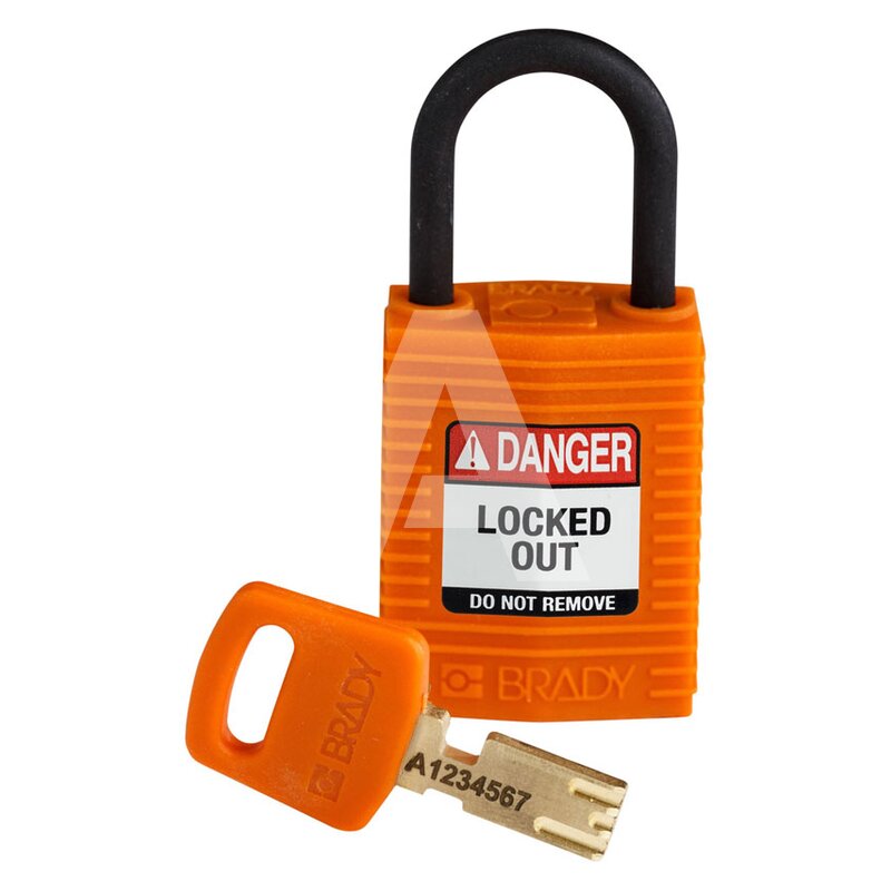 Materiał obudowy i szekli: nylon, kolor: pomarańczowy, zamykana na klucz, szekla 25 mm.