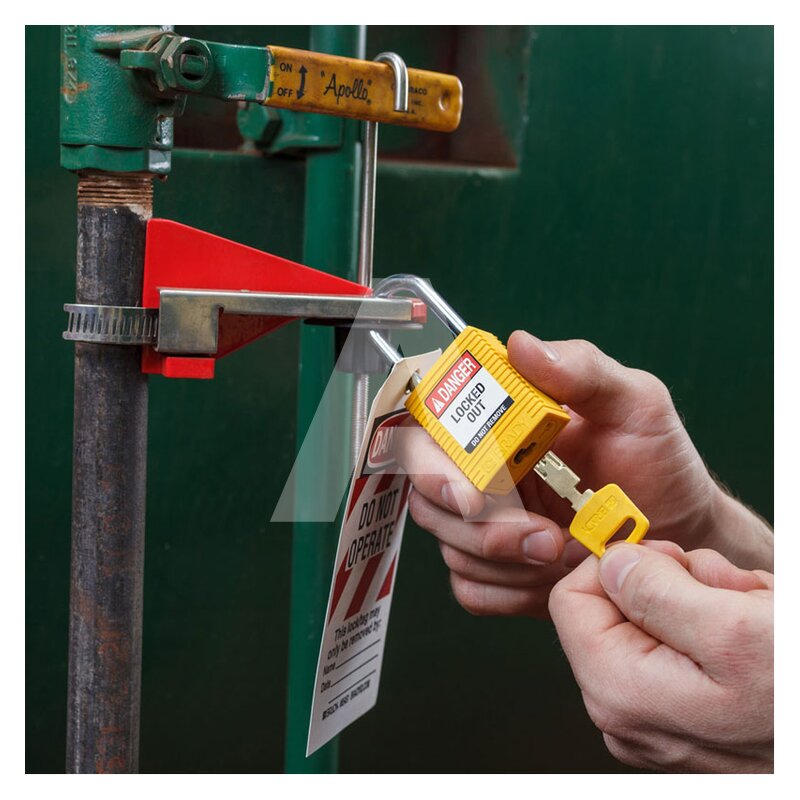 - Dopasowany kolorystycznie klucz i korpus kłódki pozwala na szybką identyfikację podczas stosowania