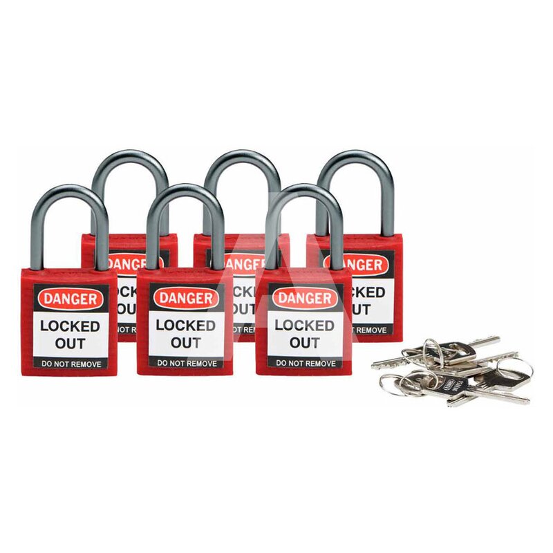 Kompaktowe kłódki są stosowane do zabezpieczania różnych newralgicznych punktów, a kompaktowe wymiary pozwalają na ich używanie w ciasnych przestrzeniach. Dodatkową ochroną jest izolowany cylinder, który sprawia, że pracownicy są chronieni przed porażeniem po włożeniu klucza. Korpus wykonany z nylonu wzmocnionego włóknem szklanym jest nieprzewodzący i nieiskrzący, dlatego doskonale nadaje się do izolowania dopływu energii, a karbowanie obudowy ułatwia chwyt i manipulowanie. Budowa mechanizmu zapewnia ochroną przed ingerencją i pozwala na uzyskanie wielu unikalnych wzorów kluczy. Każda kłódka jest dostarczana w zestawie z jednym kluczem. Istnieje możliwość sporządzenia i rejestracji kluczy niestandardowych. W komplecie jest 6 sztuk.
