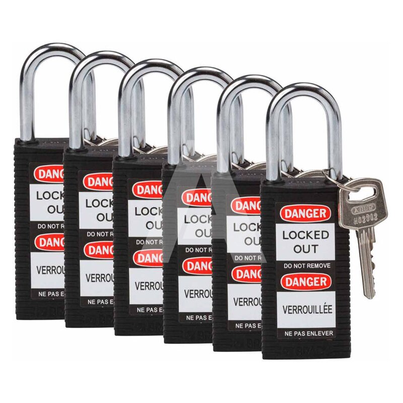 Kłódki bezpieczeństwa są używana do różnych zastosowań związanych z bezpieczeństwem. Cylinder kłódki jest izolowany, co pozwala chronić pracowników przed porażeniem po włożeniu klucza. Nieprzewodzący, nieiskrzący korpus ma żebrowaną budowę, co ułatwia chwyt i manipulowanie. Każda kłódka jest dostarczana w zestawie z jednym kluczem (istnieje możliwość sporządzenia i rejestracji kluczy niestandardowych). W komplecie jest 6 kłódek.