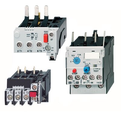 - przekaźniki termiczne - rozłączają obwody sterujące w przypadku zaniku prądu fazowego lub przekroczenia zadanej wartości, chroniąc w ten sposób urządzenia.