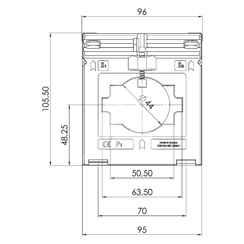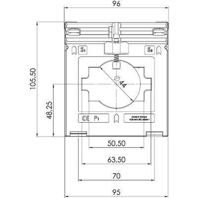 Średnica przepustu: 44 mm, szyna 1: 63x10 mm, szyna 2: 2x50x10 mm, prąd pierwotny: 300 A, wartość wtórna: 5 A, moc: 5 VA, klasa dokładności: 1.