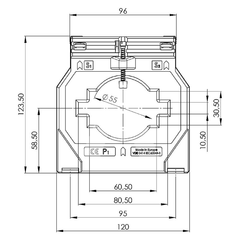 Przekładnik trójuzwojeniowy, średnica przepustu: 55 mm, szyna 1: 80x10 mm, szyna 2: 60x30 mm, prąd pierwotny: 1000-750-500 A, wartość wtórna: 1 A, moc: 10 VA, klasa dokładności: 1.
