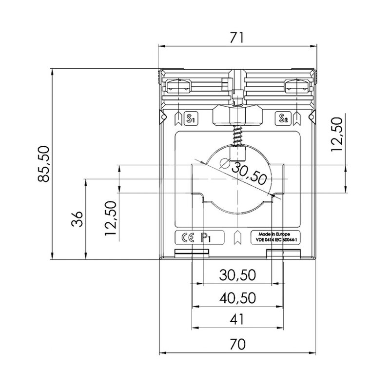Średnica przepustu: 30,5 mm, szyna 1: 40x12 mm, szyna 2: 30x15 mm, prąd pierwotny: 500 A, wartość wtórna: 5 A, moc: 2,5 VA, klasa dokładności: 1.