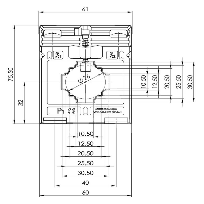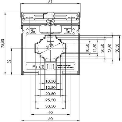 Średnica przepustu: 26 mm, szyna 1: 30x10 mm, szyna 2: 2x20x10 mm, prąd pierwotny: 200 A, wartość wtórna: 5 A, moc: 1,5 VA, klasa dokładności: 1.