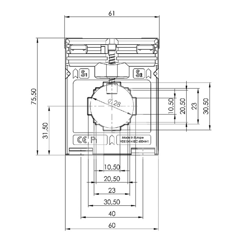 Średnica przepustu: 28 mm, szyna 1: 30x10 mm, szyna 2: 2x20x10 mm, prąd pierwotny: 250 A, wartość wtórna: 5 A, moc: 5 VA, klasa dokładności: 1.