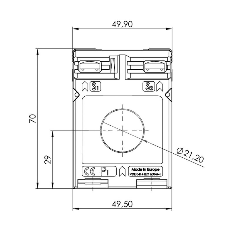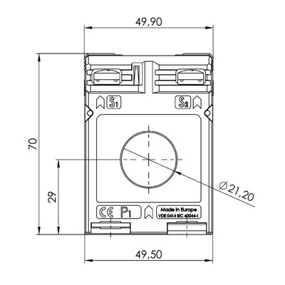 Średnica przepustu: 21,2 mm, moc: 2,5 VA, klasa dokładności: 1, prąd pierwotny: 60 A, wartość wtórna: 1 A.