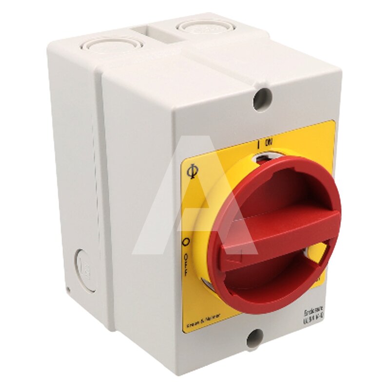 Rozłącznik KG10.T203/40.KS51V, 20 A, 3 polowy, w obudowie szarej z tworzywa odpornej na promieniowanie UV, z żółtą tabliczką i czerwonym pokrętłem z możliwością blokady na kłódkę.