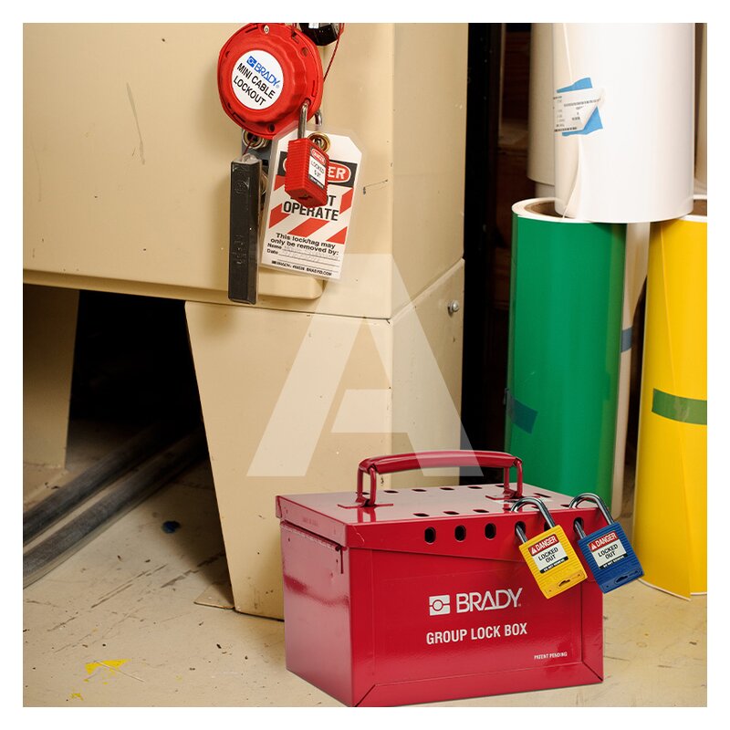 Skrzynka służy do blokowania grupowego w miejscach gdzie pracuje większa ilość pracowników. Gwarantuje bezpieczne blokowanie. Wykonana jest z odpornej stali i pomalowana proszkowo na kolor czerwony (dodatkowa ochrona przed rdzą). Mieści do 12 kłódek blokujących, ale może również służyć jako zamykana skrzynka do przechowywania kłódek (do 75 sztuk). Szczelina z przodu umożliwia włożenie kluczy po zamknięciu skrzynki. Kłódki i inne komponenty są sprzedawane oddzielnie.