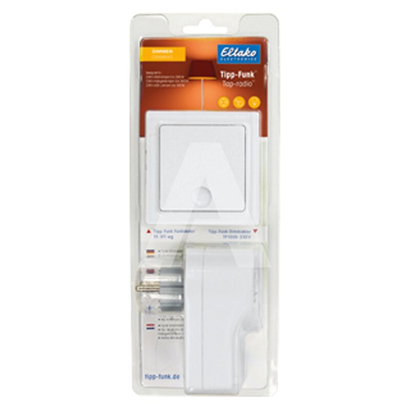 Zestaw z bezprzewodowym przełącznikiem Tap-radio® TF-1FT oraz adapterem uniwersalnego ściemniacza Tap-radio® TF100D-230V. Do adaptera można podłączyć obciążenie: żarówki konwencjonalne (żarowe) i halogenowe 230 V (R) do 300 W, ściemnialne lampy LED 230 V do 100 W, ściemnialne lampy energooszczędne ESL do 100 W, transformatory elektroniczne (C) do 300 W.
