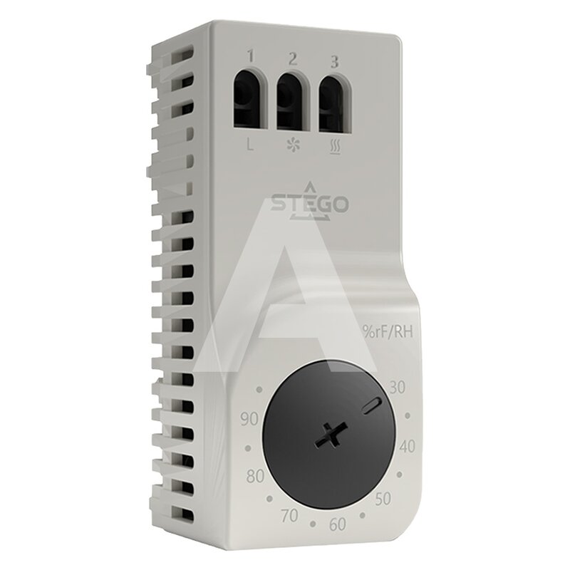 Higrostat mechaniczny, zakres nastaw i pomiaru od 35% do 95% RH, model 01250.0-00. Wymiary: 35x84x43 mm. Higrostat mierzy wilgotność względną w obudowach zawierających podzespoły elektryczne i elektroniczne. Po przekroczeniu nastawionego progu wilgotności względnej załączany jest układ grzewczy, który zapobiega tworzeniu się kondensatu wewnątrz obudowy.