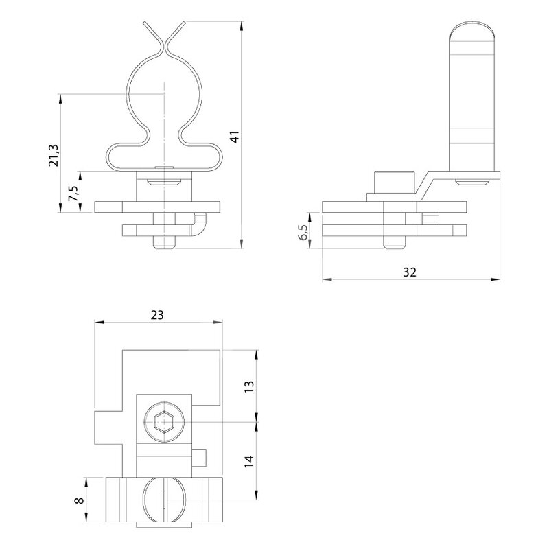 Materiał: stal, sposób montażu: na szynę typu C, wymiary: 32x23x41 mm. Przeznaczona do uziemiania 1 kabla, zakres mocowania: 11-17 mm. Klamra jest stosowana wszędzie tam, gdzie ekran kabla musi być uziemiony. Jest łatwa w użyciu i skuteczna w uziemieniu pojedynczych kabli. W przypadku stosowania typów ze zintegrowanym odciążeniem kable mogą być mocowane przez płaszcz kabla za pomocą opasek kablowych. W ten sposób uzyskuje się odciążenie zgodnie z normą EN 62444. Dzięki specjalnej konstrukcji zakresy zacisku są bardzo duże przy stosunkowo niewielkich wymiarach.