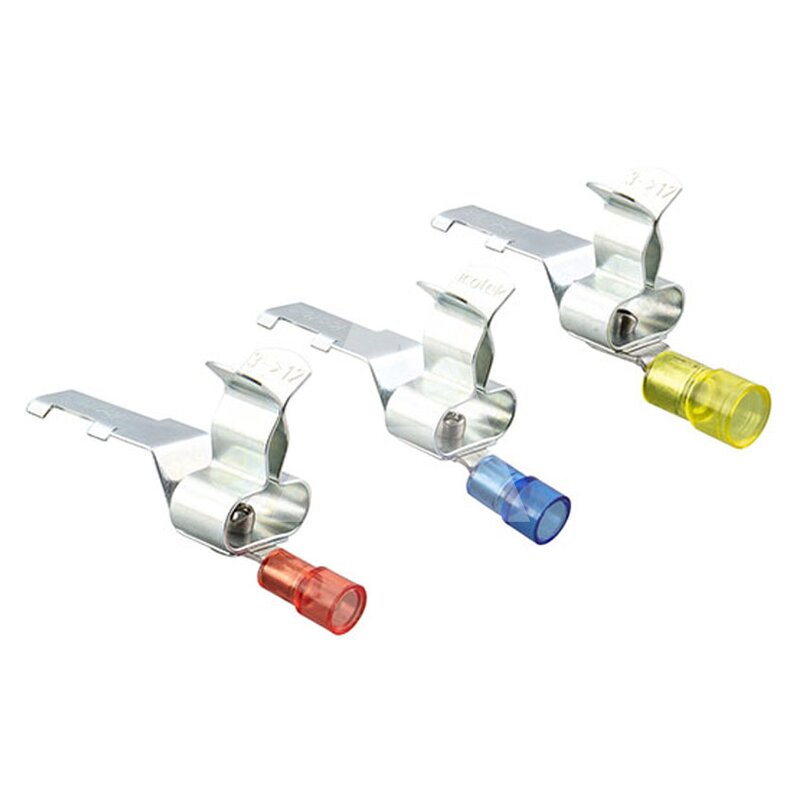 Materiał: stal ocynkowana i poliwęglan, sposób montażu: nitowanie, wymiary: 46,5x15x26 mm. Przeznaczona do uziemiania 1 kabla, zakres mocowania: 3-12 mm. Klamra jest stosowana wszędzie tam, gdzie ekran kabla musi być uziemiony. Jest łatwa w użyciu i skuteczna w uziemieniu pojedynczych kabli. Umożliwiają bezpieczne zamocowanie kabla za pomocą opasek kablowych. Zaciski ekranów są montowane na pierścieniowych końcówkach kablowych, które można zaciskać na kablach PE. Wielkość średnicy pierścieniowej końcówki kablowej jest oznaczona różnymi kolorami (czerwone, niebieskie, żółte).
