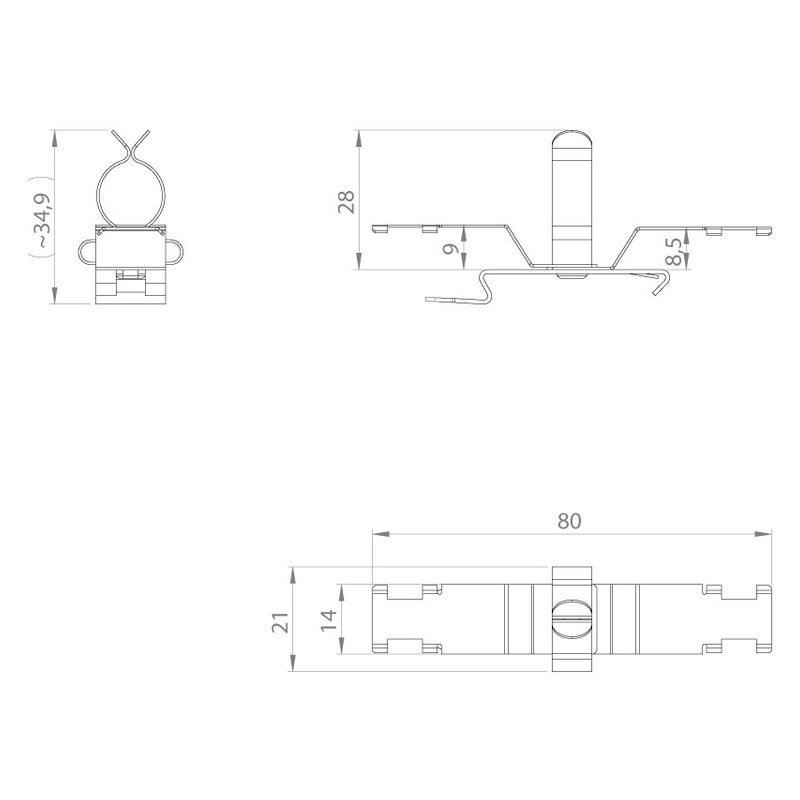 Materiał: stal, sposób montażu: na szynę DIN 35 mm, wymiary: 80x21x34,9 mm. Przeznaczona do uziemiania 1 kabla, zakres mocowania: 11-17 mm. Klamra jest stosowana wszędzie tam, gdzie ekran kabla musi być uziemiony. Jest łatwa w użyciu i skuteczna w uziemieniu pojedynczych kabli.