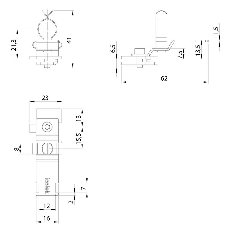 Materiał: stal, sposób montażu: na szynę typu C, wymiary: 62x23x41 mm. Przeznaczona do uziemiania 1 kabla, zakres mocowania: 11-17 mm. Klamra jest stosowana wszędzie tam, gdzie ekran kabla musi być uziemiony. Jest łatwa w użyciu i skuteczna w uziemieniu pojedynczych kabli. W przypadku stosowania typów ze zintegrowanym odciążeniem kable mogą być mocowane przez płaszcz kabla za pomocą opasek kablowych. W ten sposób uzyskuje się odciążenie zgodnie z normą EN 62444. Dzięki specjalnej konstrukcji zakresy zacisku są bardzo duże przy stosunkowo niewielkich wymiarach.